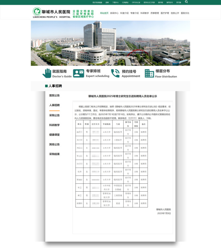 聊城市人民医院官网发布的一则《聊城市人民医院2025年博士研究生引进拟聘用人员名单公示》近日引起舆论关注。